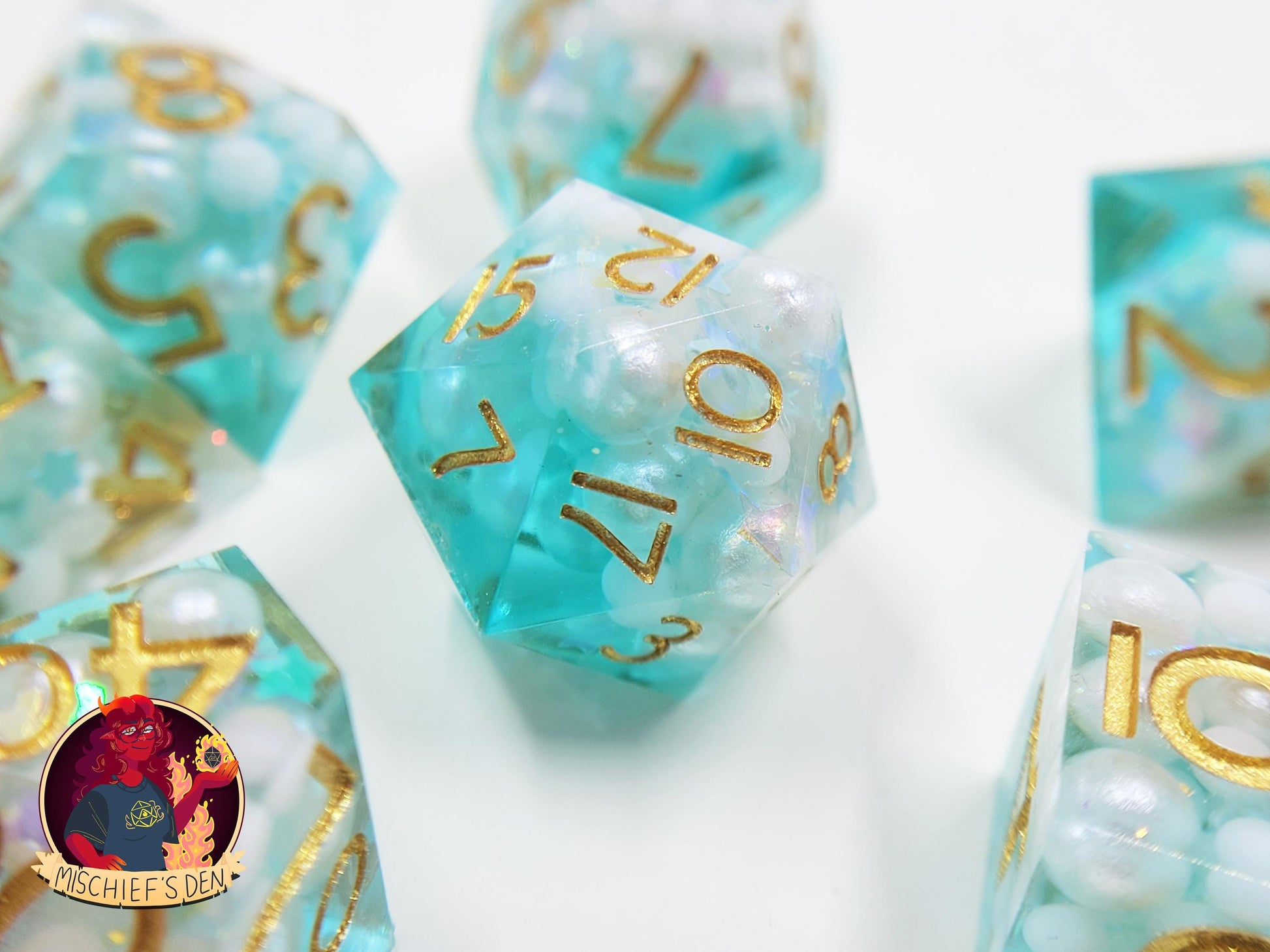 These dice have teensy faux pearls of varying sizes inside of them with sparkling prismatic star-shaped glitter scattered throughout. Bright sky blue resin caps them off, with shimmering glitter swirling around as if they were dreams captured within. They are inked in a bright gold that perfectly matches the dreamy aesthetic!