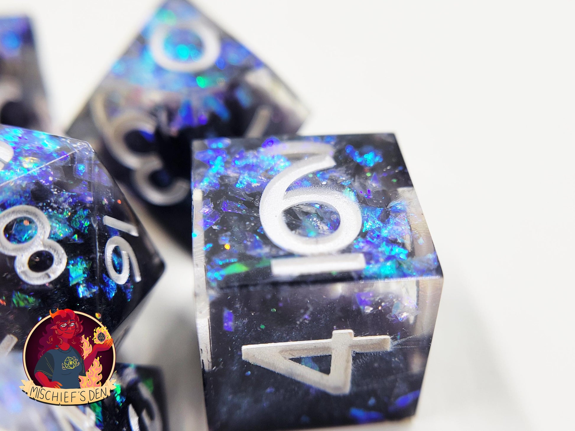 Handmade set by me! These dice shimmer with deep blue and black tones, topped with a glittery clear resin with iridescent flakes that brilliantly blaze in light, reminiscent of black lightning opals. The flakes have an almost glowing look to them and have more colors than I can capture in photos. In regular light, these are amazing. In sunlight or bright lighting, these are unbelievably spectacular. They have been inked with a pearlescent white that underscores their beauty.